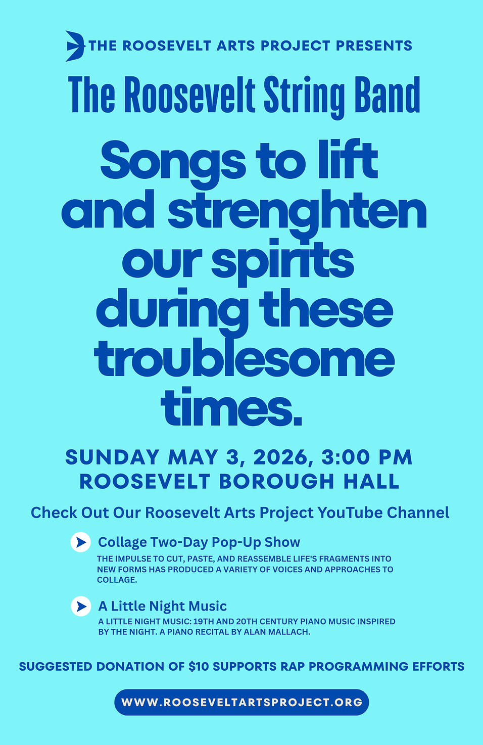 The Roosevelt Arts Project (RAP) is a collaborative venture of friends and neighbors in and around Roosevelt, New Jersey. Bringing together artists in a variety of media, our mission is to foster collaboration and present their work to the public.